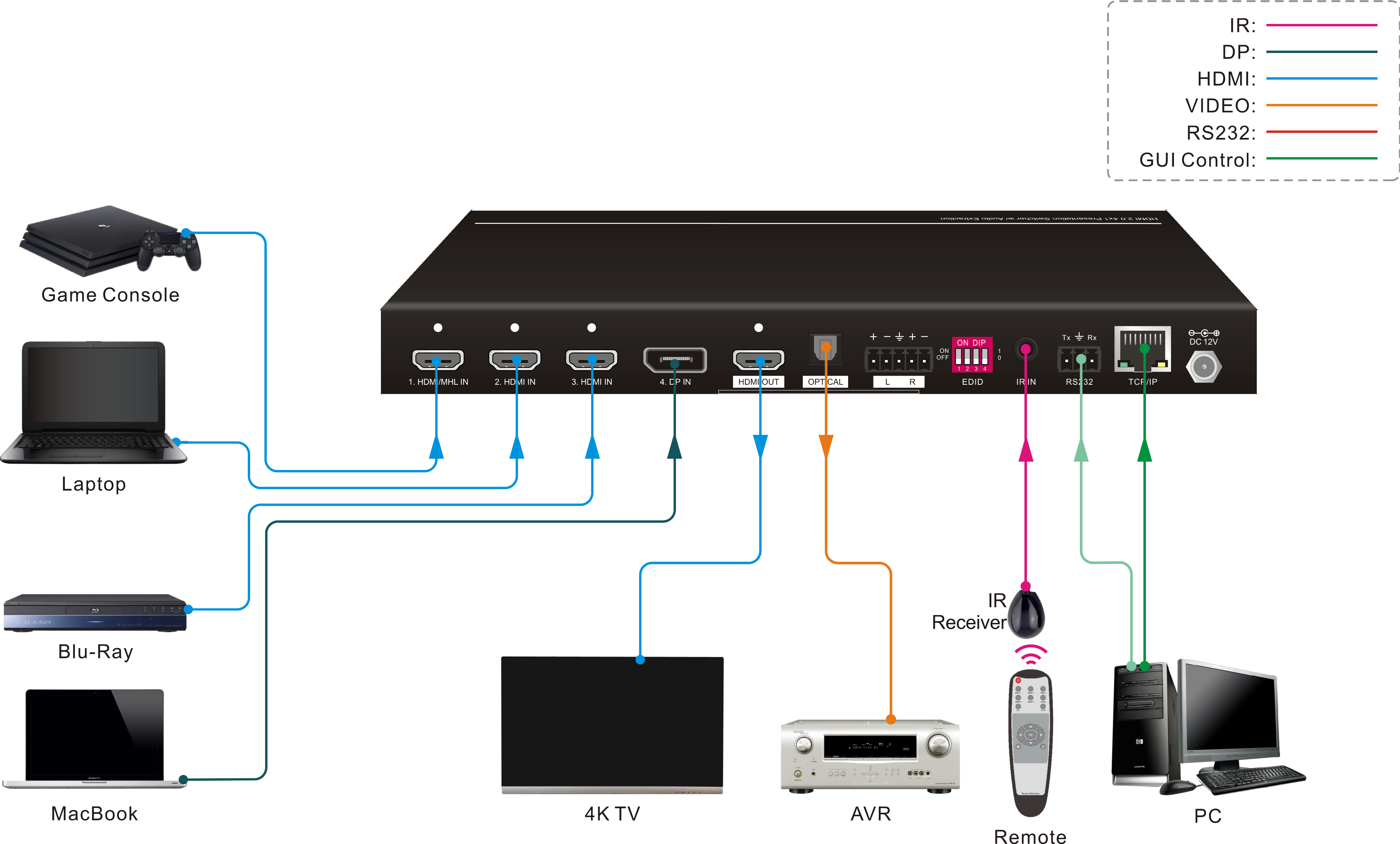 Umschaltung erfolgt per Tastendruck, Autoswitch (automatische Quellenerkennung), RS232, Infrarot-Fernbedienung und Web-Interface